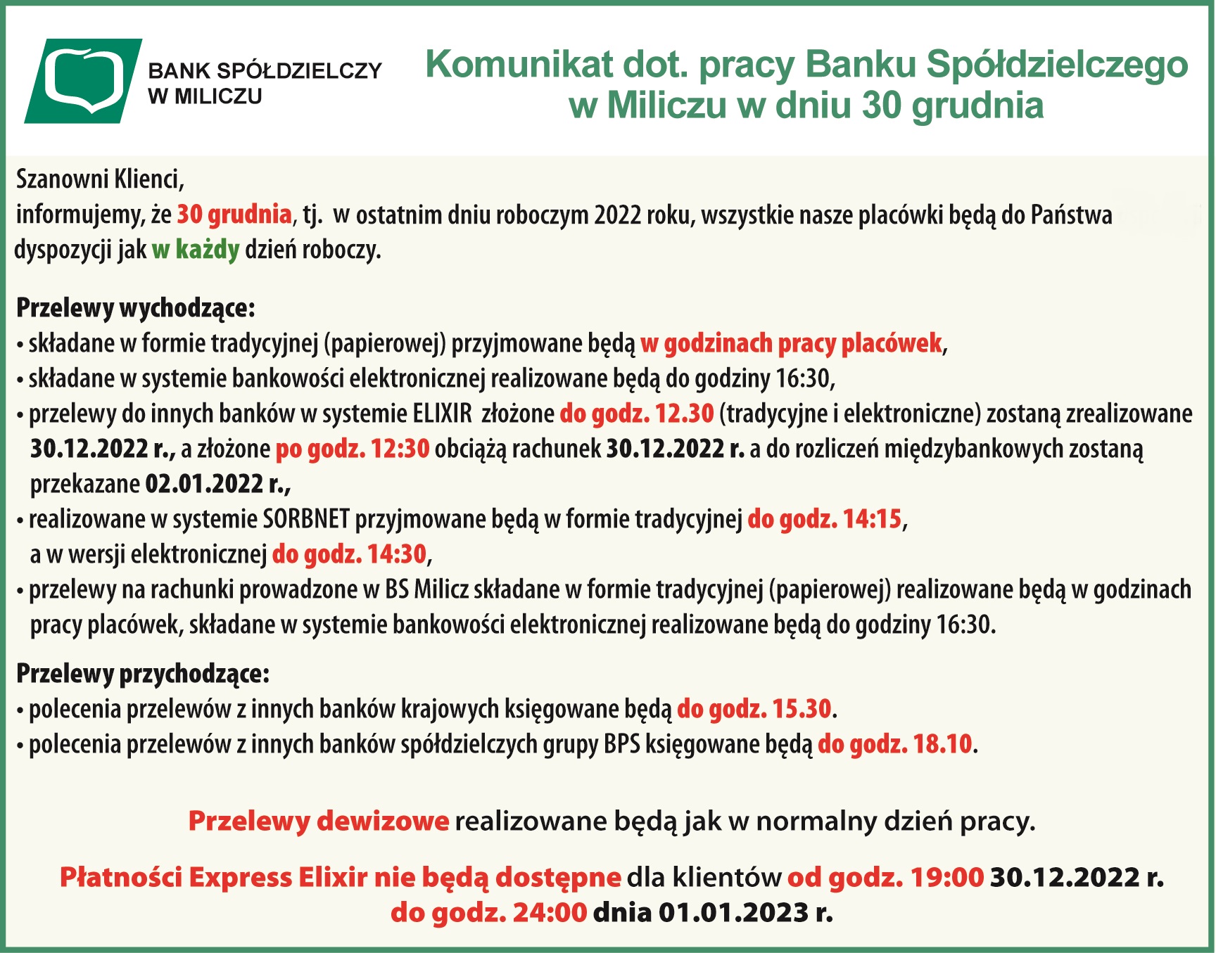 Realizacja przelewów w ostatnim dniu roboczym roku 2022